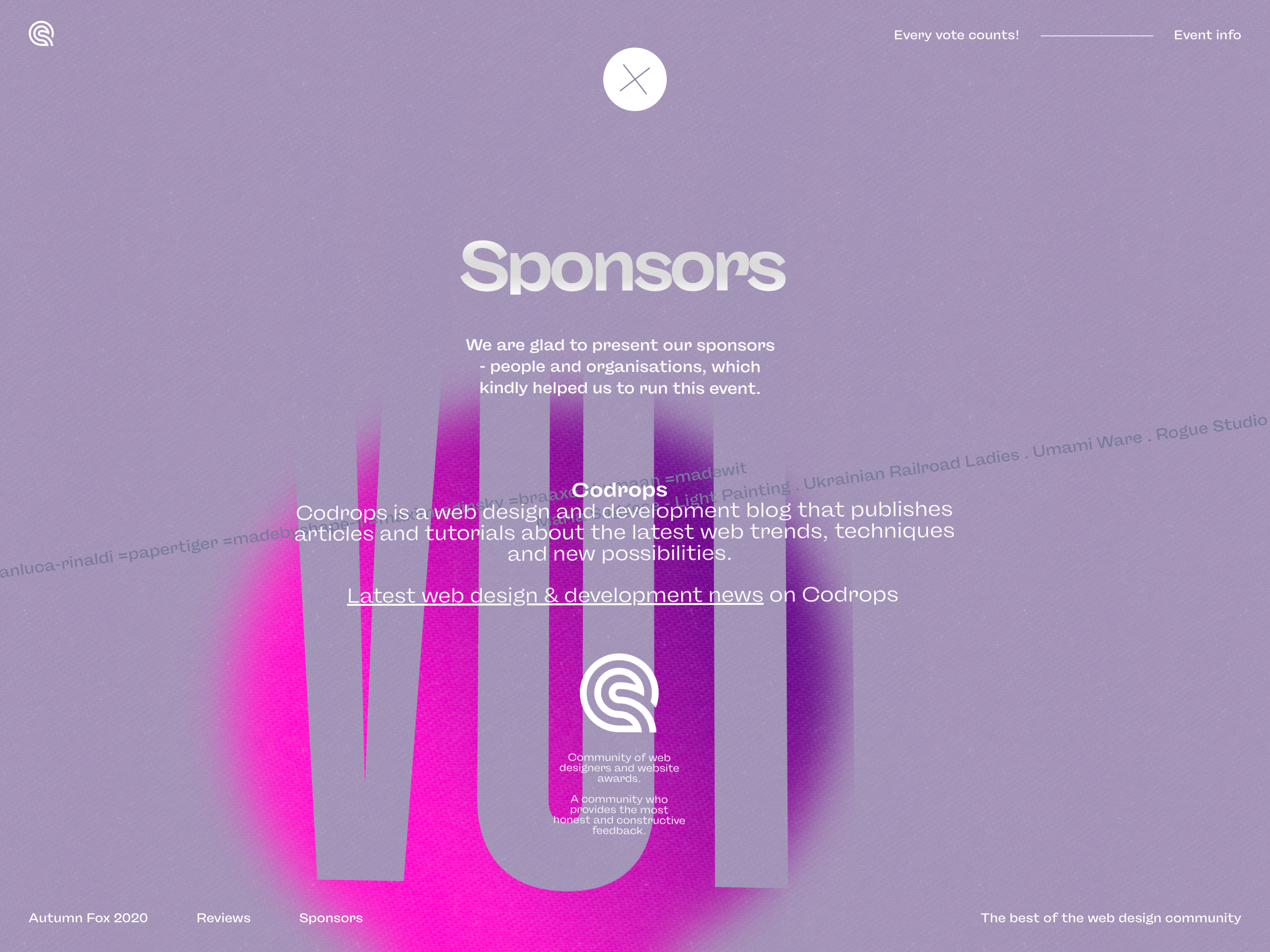 Discover and vote for the most creative, innovative, and inspiring websites of autumn 2020 from the best solo designers and web design agencies of the Cssfox web design community. Maxim Aginsky and Andrii Zhukovskyi designed and developed the event website.