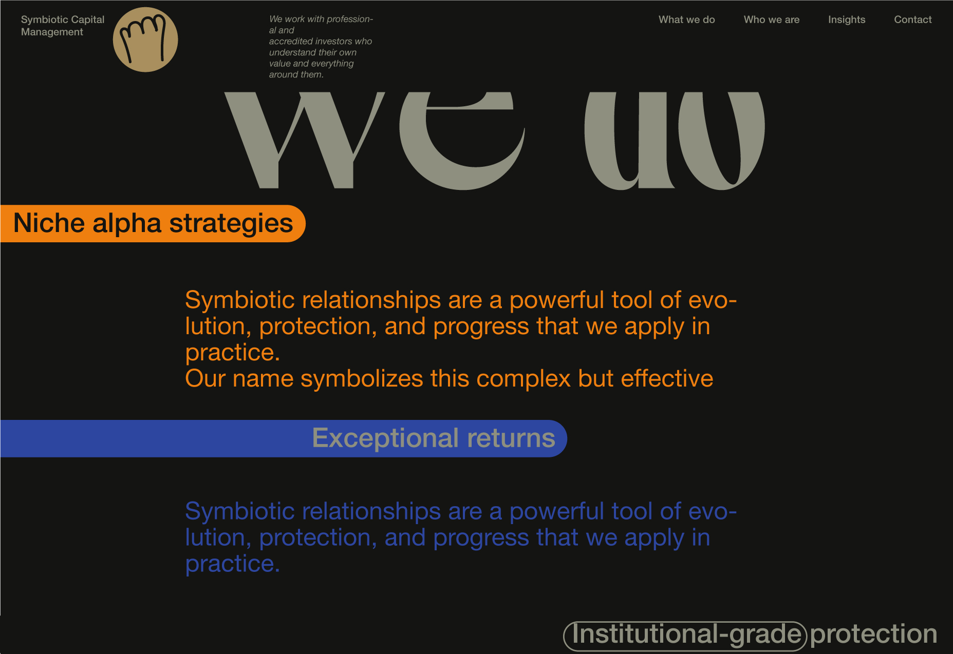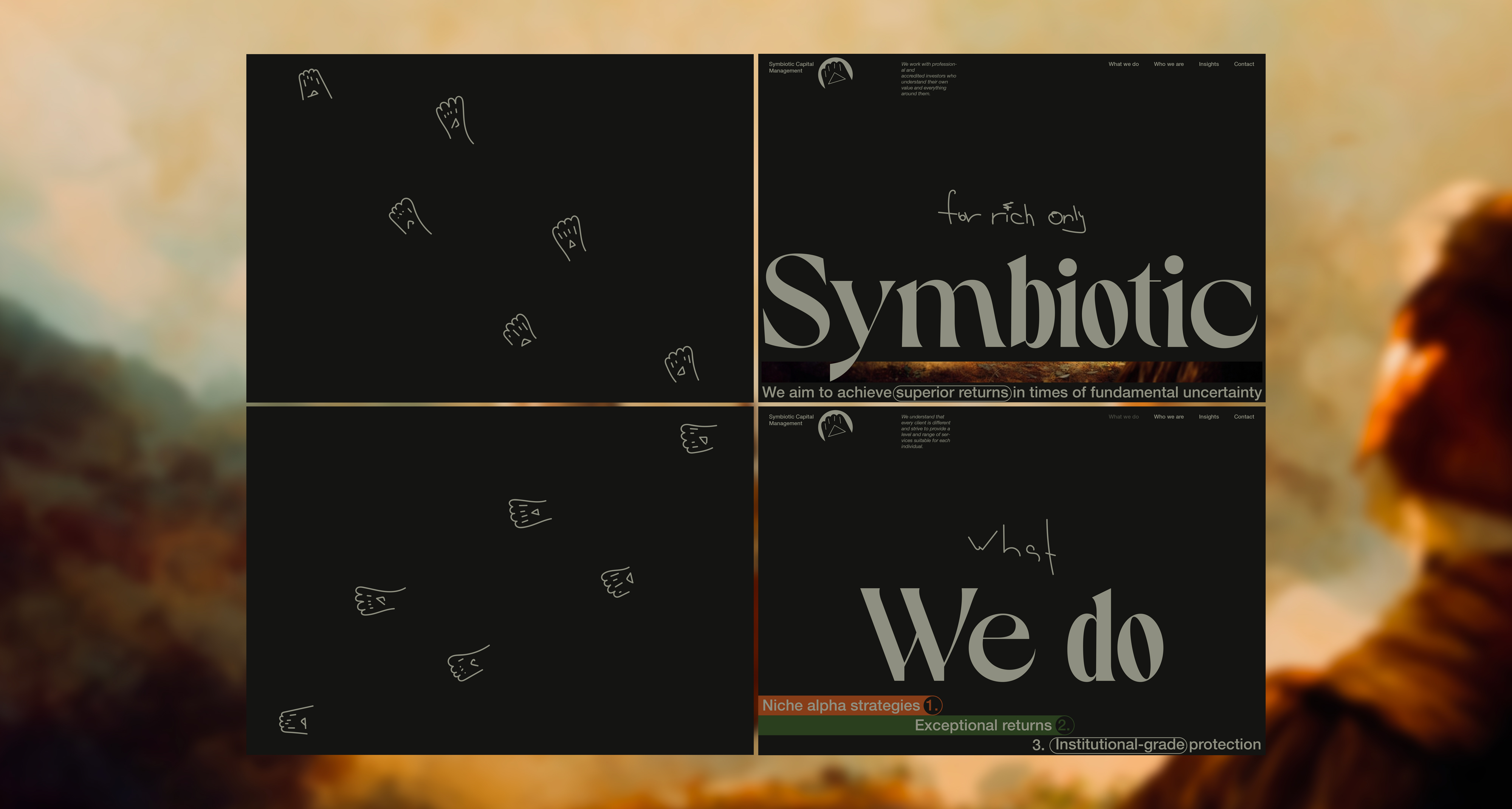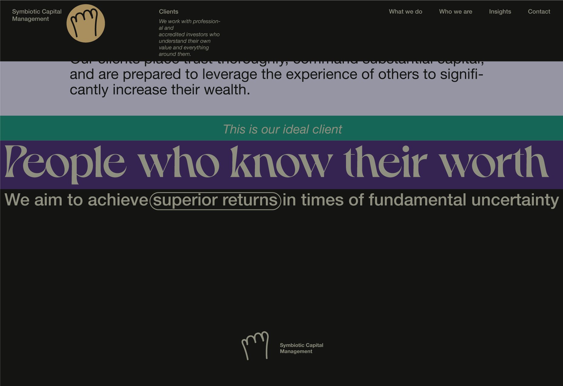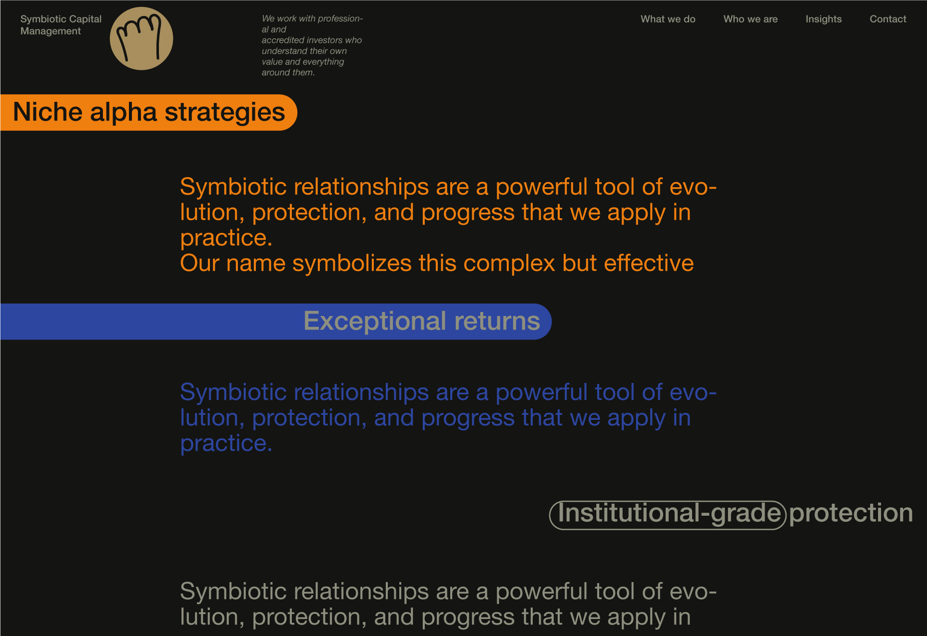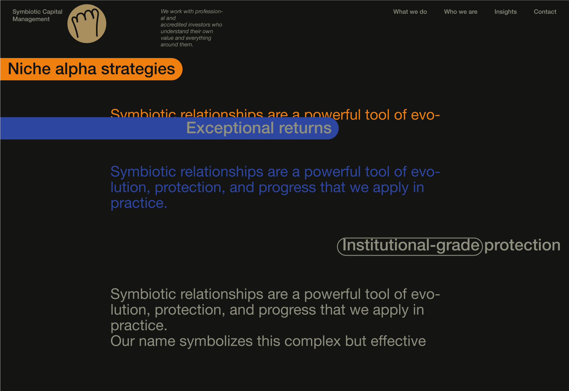 Here, I will be showcasing the website and brand identity formation process for Symbiotic Capital Management. This article includes all the materials from the beginning of the work to the point when I felt I had found the right vector and was ready to share it with folks.