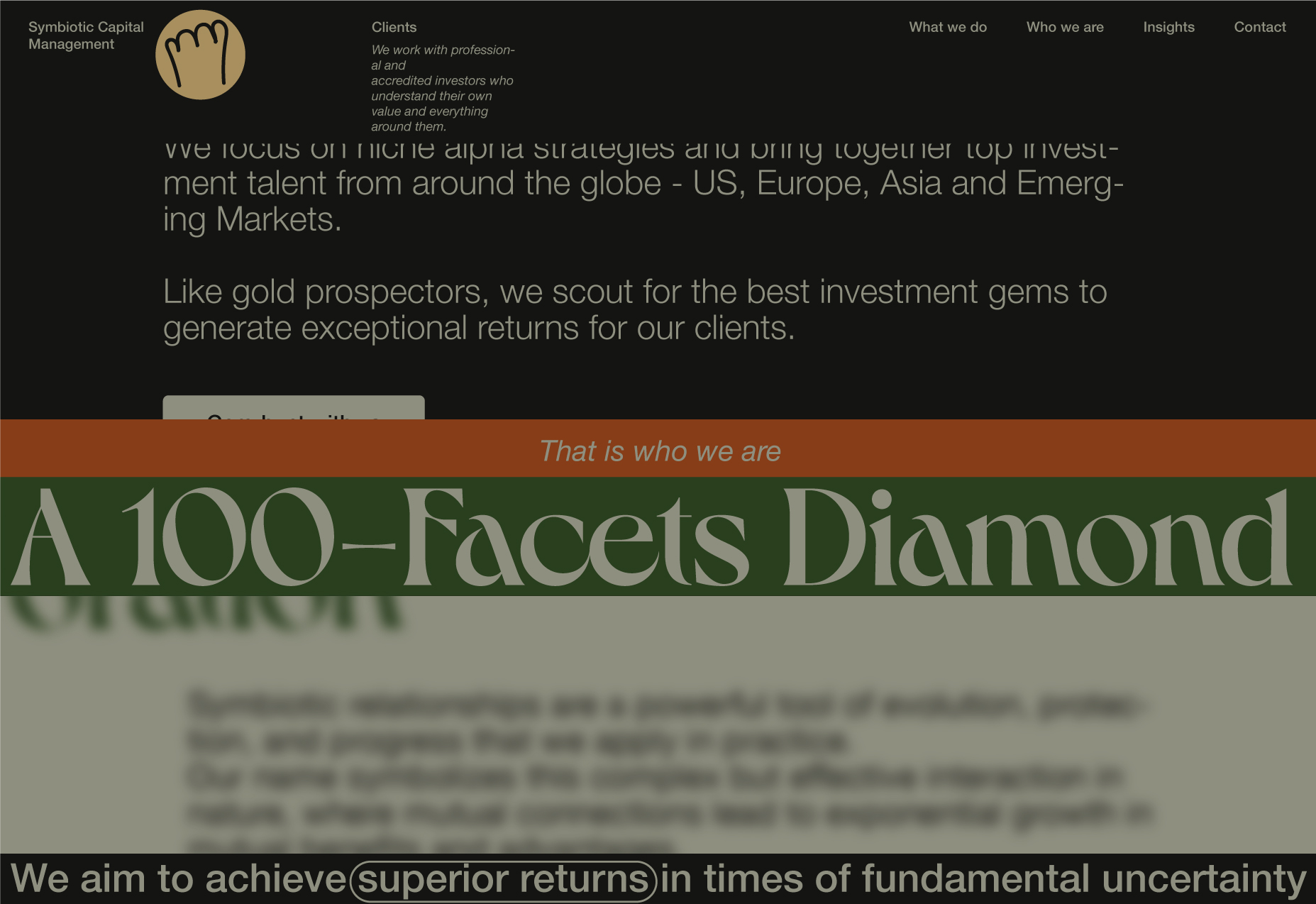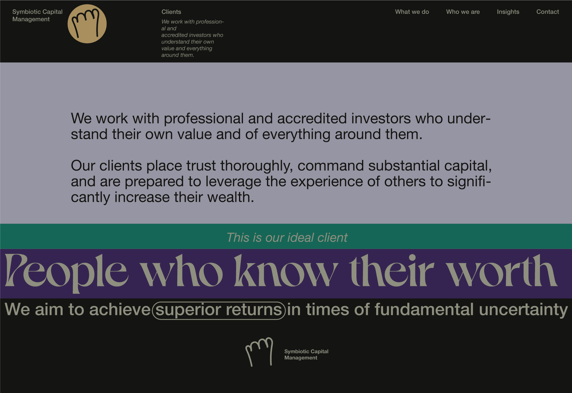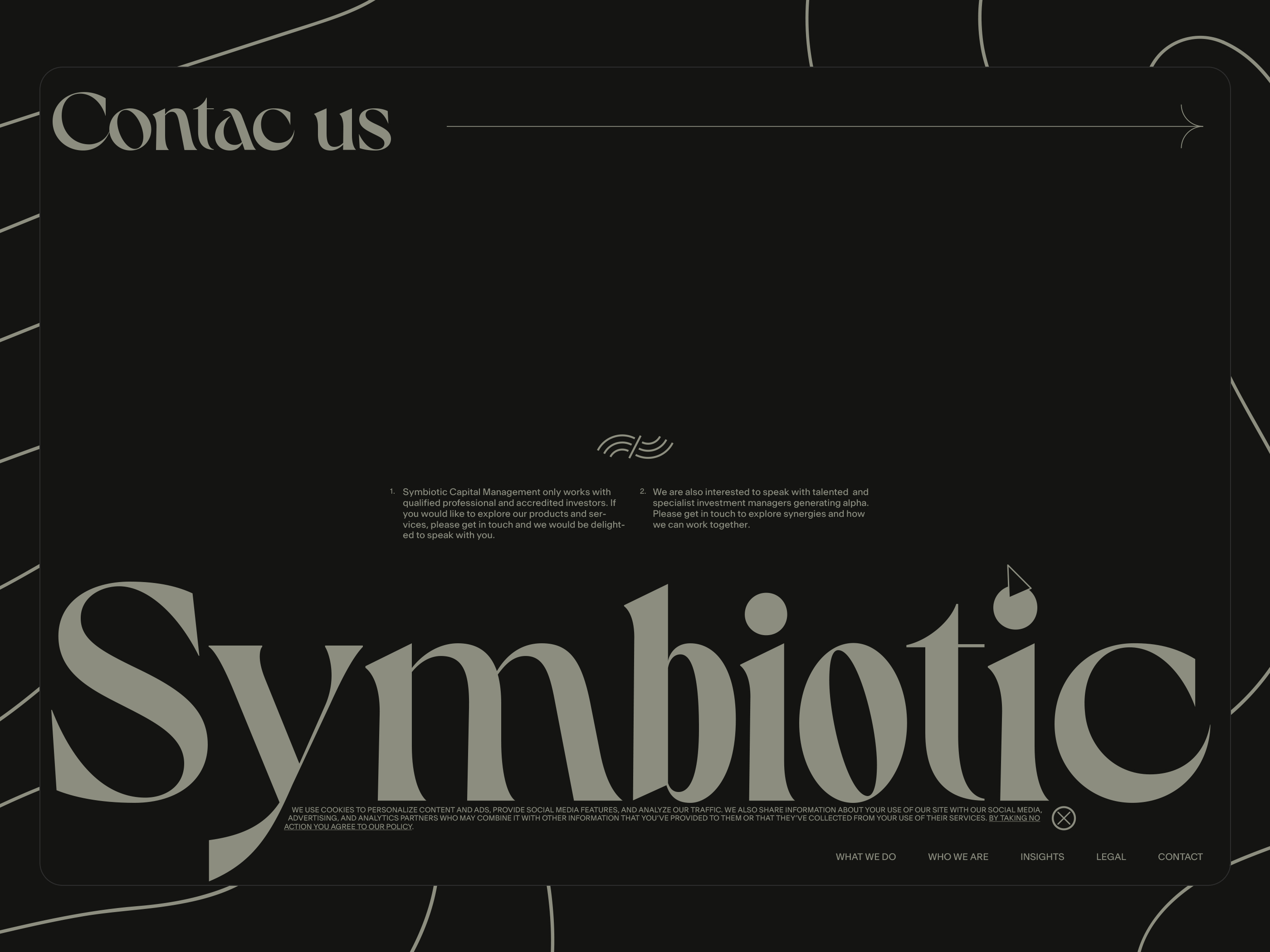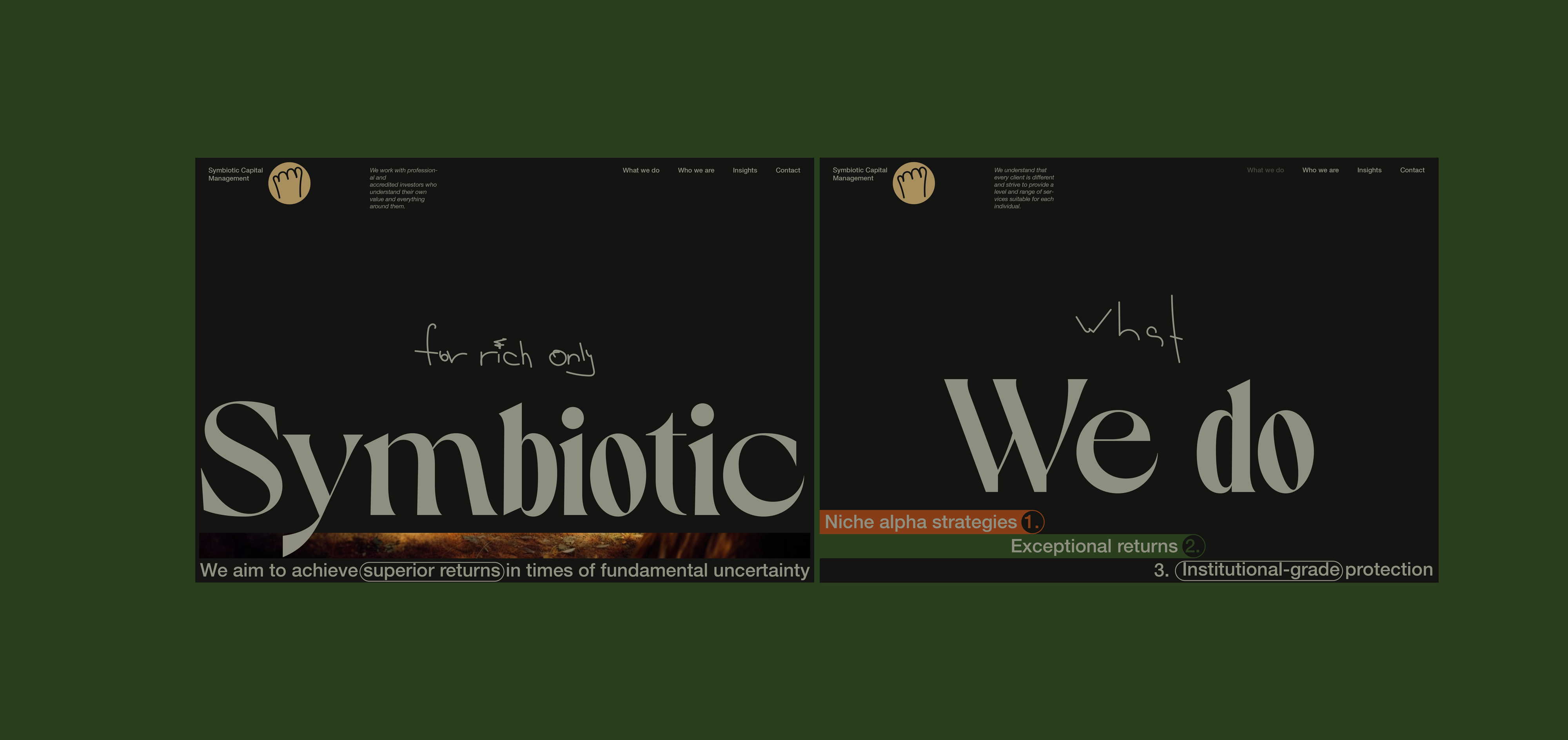 Here, I will be showcasing the website and brand identity formation process for Symbiotic Capital Management. This article includes all the materials from the beginning of the work to the point when I felt I had found the right vector and was ready to share it with folks.