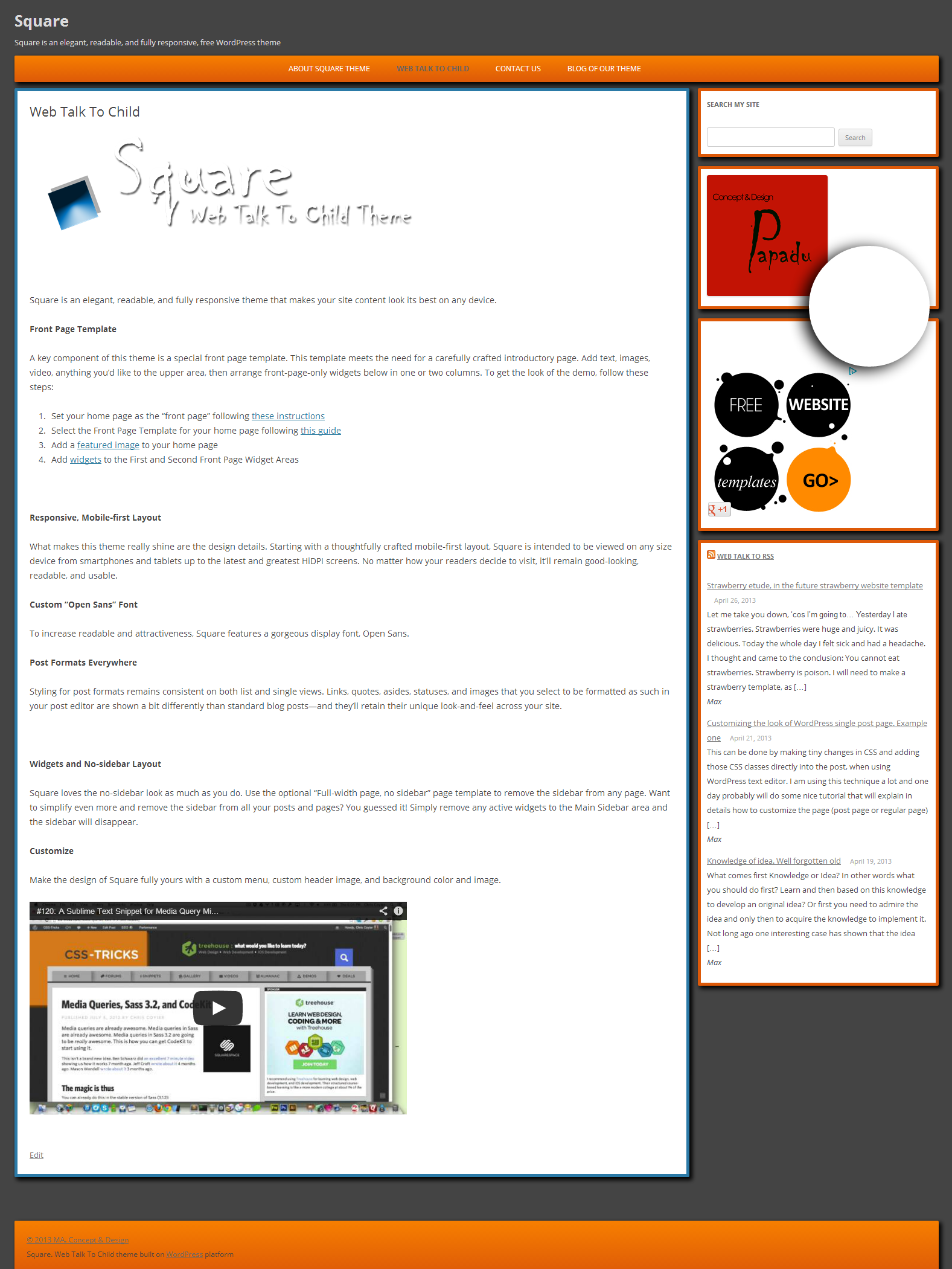 I am completely satisfied with the current version (version 1) of Web Talk To website. Nevertheless I constantly think over other design solutions for the site. Square is the result of such work. The result of creative search. Square can be defined, as a child theme of our website.