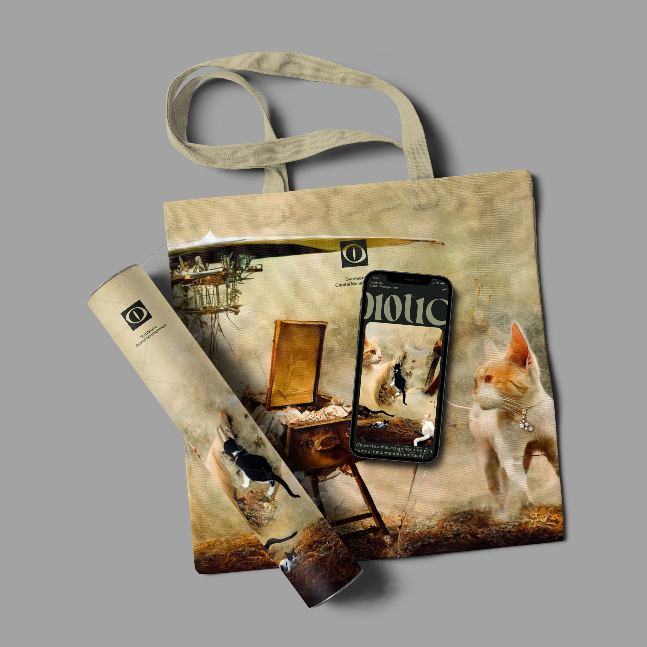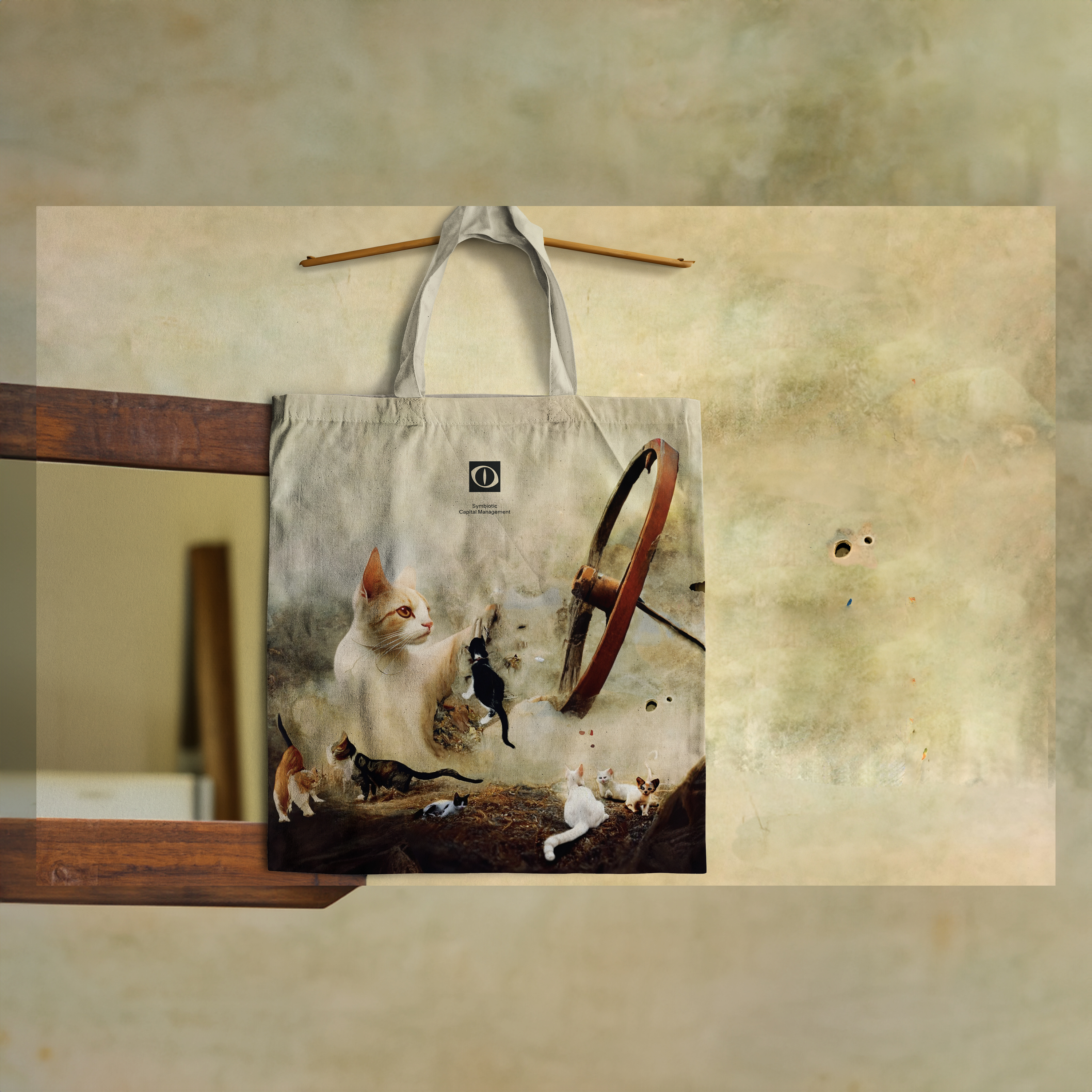 Artwork “Nine lives”, logomark, and company name on the tote bag.