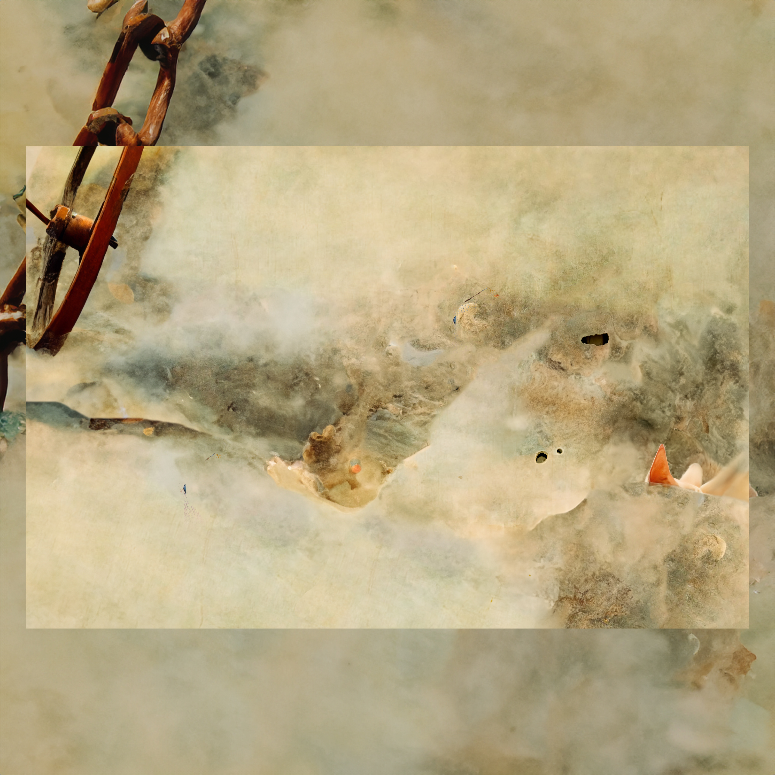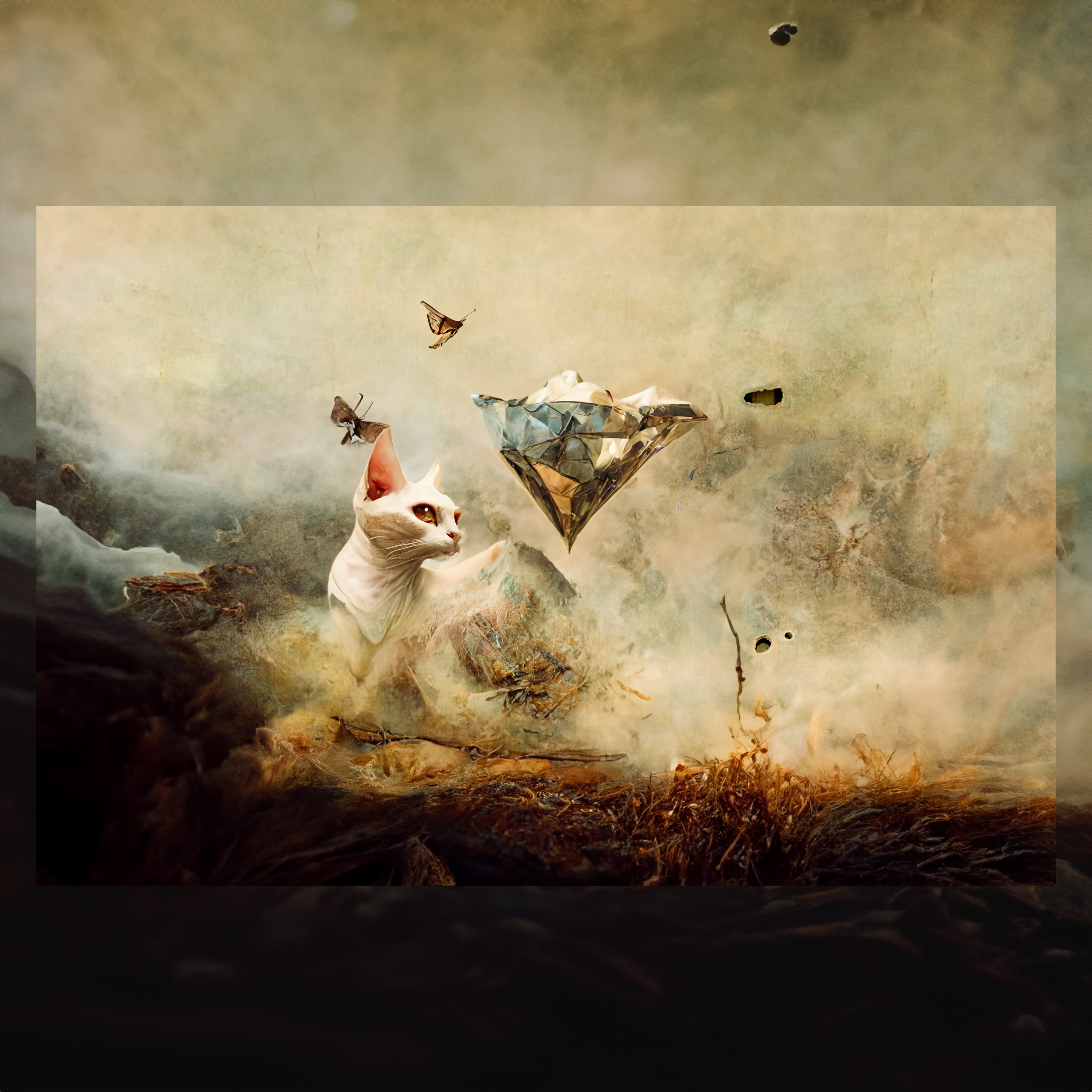 Artwork “Escape Attempt” on a tote bag, a paper tube, and a screen on the iPhone 13 with the “Nine Lives. Heaven” artwork.